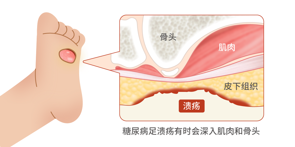 由于糖尿病患长期处于高血糖的状态,会对周边神经、血管产生损伤,这时若再出现足部受力不均而导致硬茧或外伤的话,就有可能进一步造成伤口难以愈合、皮肤黏膜组织破损的糖尿病足溃疡 (DFU)2。而且溃疡伤口不一定仅限于皮肤,还可能影响到深层组织,如韧带、肌腱、骨头等3。