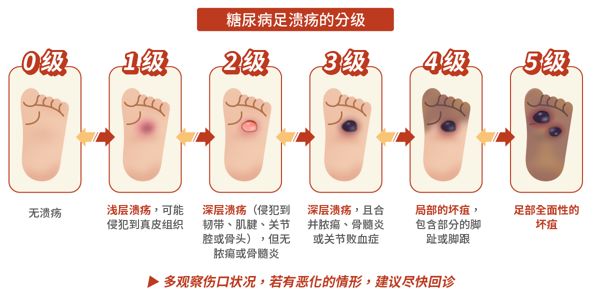Wagner溃疡分级系统是目前最常见的糖尿病足溃疡分级方式4,根据伤口侵犯的深度、组织坏死的程度等分成6个等级 (0-5级) 5,将伤口分级的目的为帮助医疗人员快速了解患者足部组织损伤的程度,进而提供合适的治疗策略。