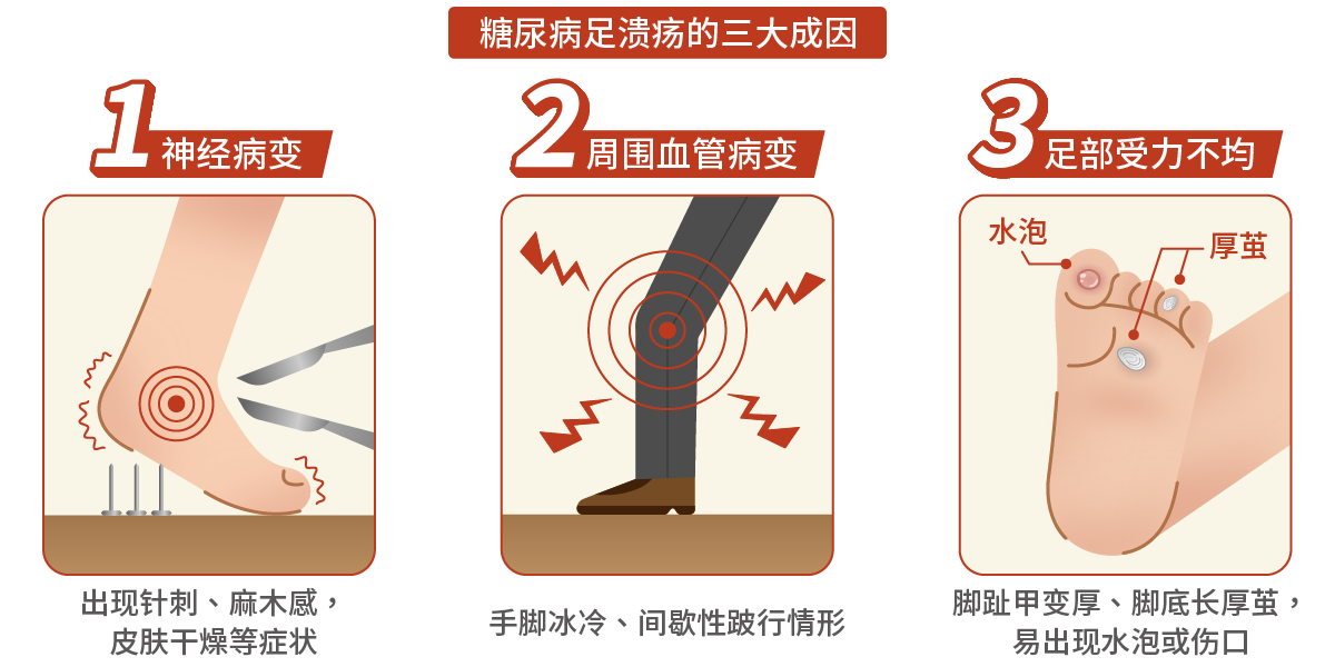 糖尿病足溃疡 (DFU) 的成因和糖尿病的并发症脱离不了关系,主要跟三大成因:神经病变、周围动脉疾病和足部受力不均有关。