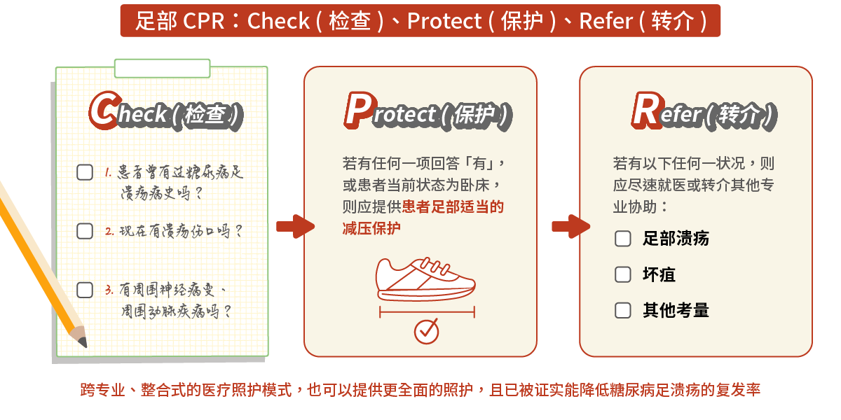 足部CPR4(Check检查、Protect保护、Refer转介)是一个简单且有效的照护方法。能快速地评估患者的状态,并在必要时提供足部保护,同时根据患者的情况考虑就医或转介其他专业。