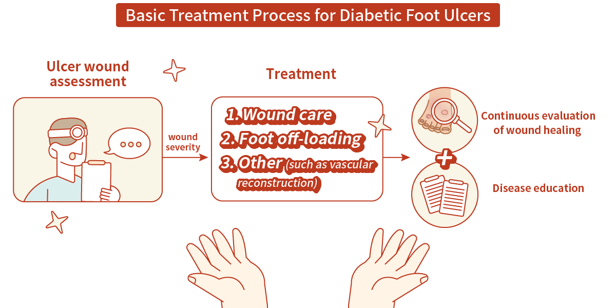 The management of Diabetic Foot Ulcers (DFU) fundamentally includes three main treatment principles: wound care, offloading, and education1. Patients with diabetes, whether they have a DFU or not, should constantly prevent the occurrence or worsening of ulcerative wounds, especially those with risk factors. If ulcers symptoms are present, it is advised to seek medical attention promptly and consult healthcare professionals.