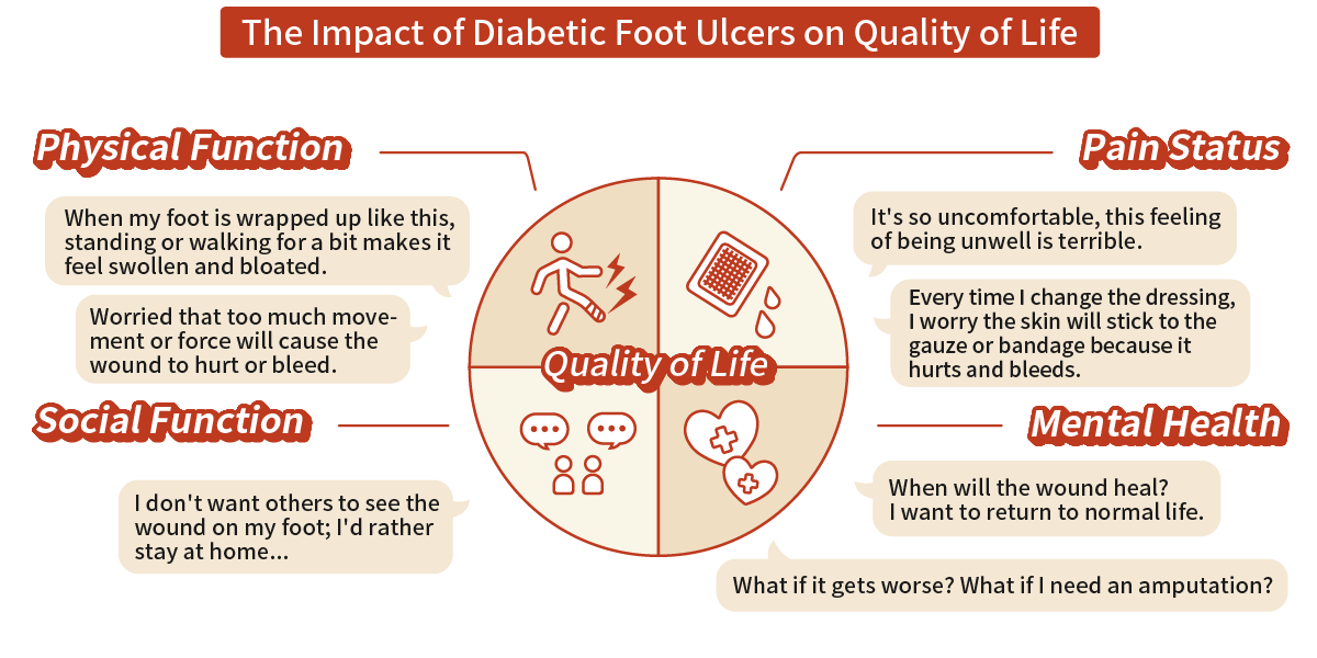 Diabetic Foot Ulcers (DFU) profoundly affect the health-related quality of life (HRQoL) of patients living with the wound1. Therefore, in addition to considering the pathological condition of the wound, we should also consider the challenges patients face in the following areas: