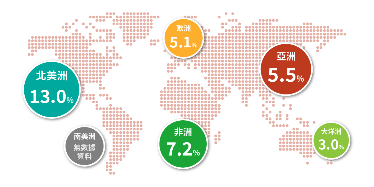 糖尿病足潰瘍在全球的盛行率約為6.3%,各洲比率則為:北美洲13.0%、非洲7.2%、亞洲5.5%、歐洲5.1%,大洋洲則為3.0%3。DFU為個案所帶來的生理和心理影響,以及對全球醫療系統的負擔皆不可忽視,若未及時治療,足部潰瘍可能進一步造成感染、壞疽,嚴重者甚至需要截肢2。