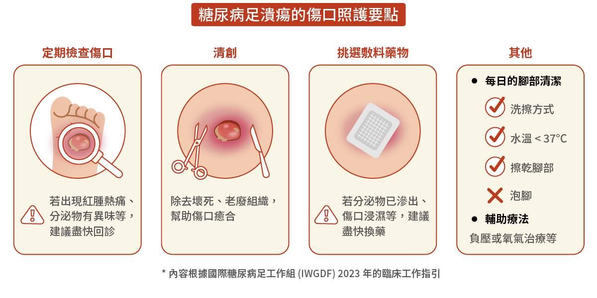 根據國際糖尿病足工作組 (IWGDF) 2023年的臨床工作指引,可以提出以下對於局部潰瘍照護的建議2,3: