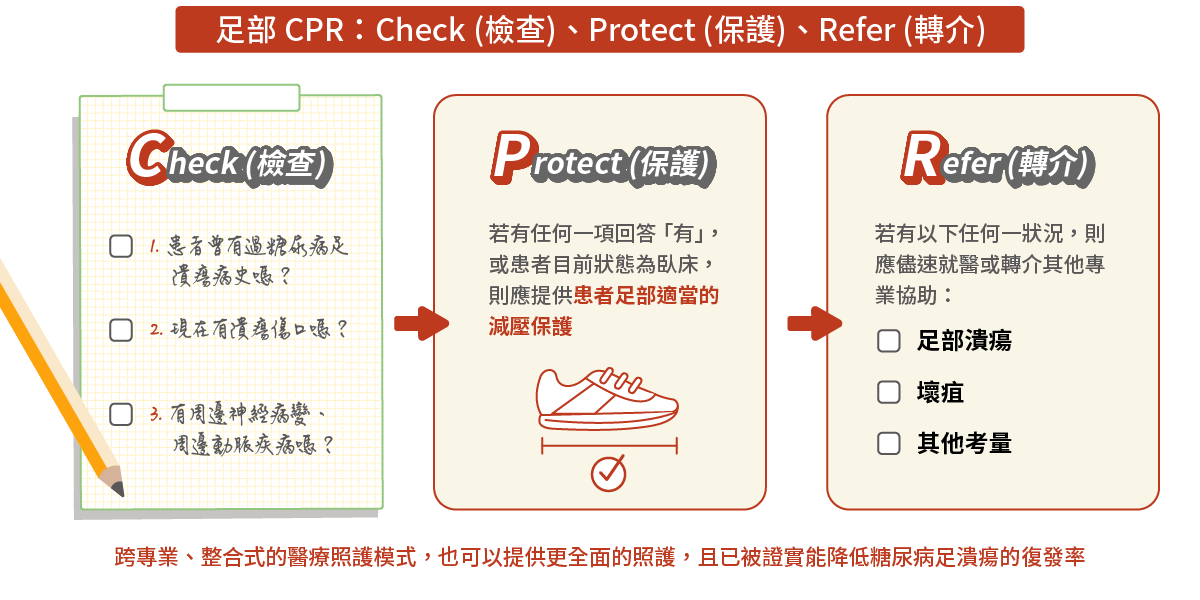 足部CPR4(Check檢查、Protect保護、Refer轉介)是一個簡單且有效的照護方法。能快速地評估患者的狀態,並在必要時提供足部保護,同時根據患者的情況考慮就醫或轉介其他專業。